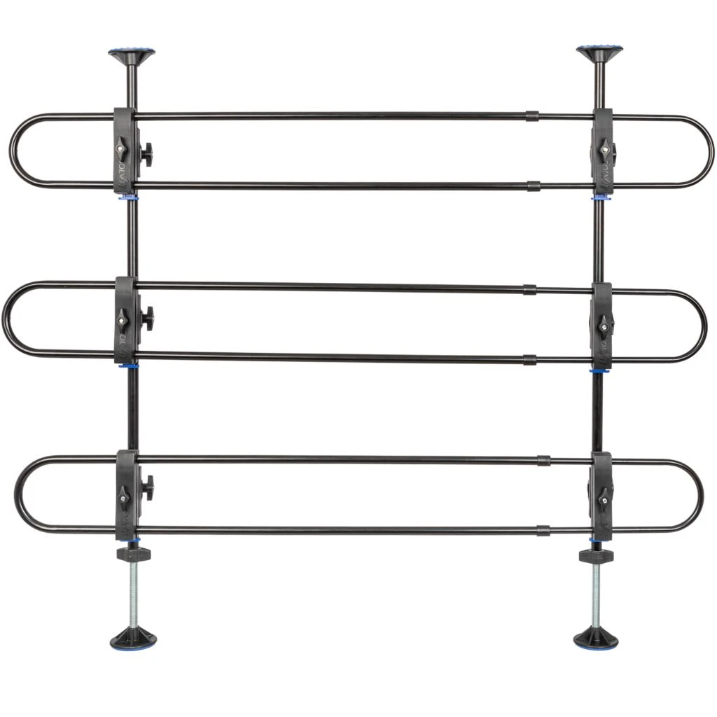 - Simple to setup- Tension secures the barrier in place and rubberized caps keep it from slipping during use; rattle-free design of the metal barrier reduces noise on road trips